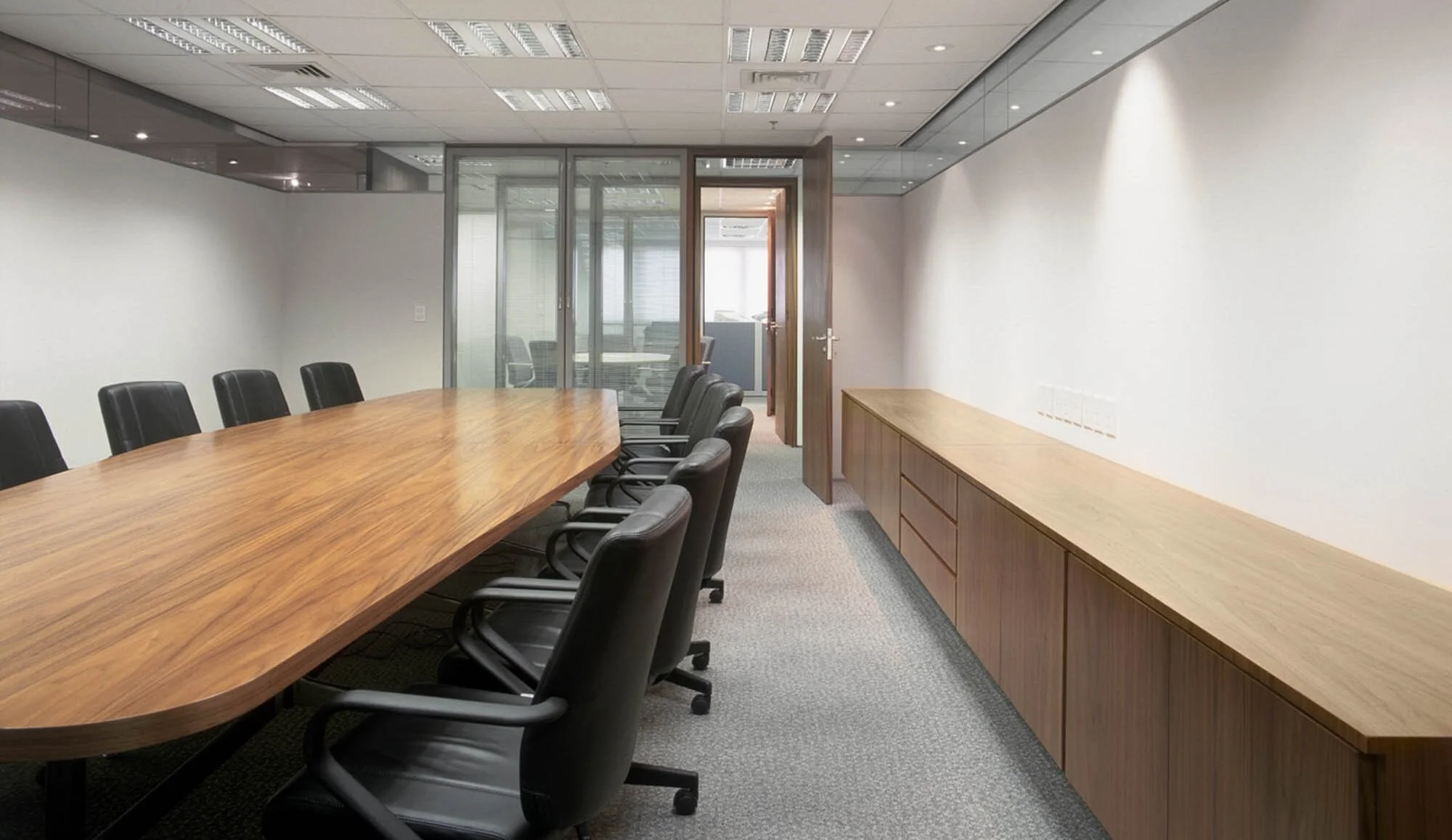 Após o hall, todas as salas são impecavelmente brancas, com carpete cinza e mesas de madeira ou brancas.